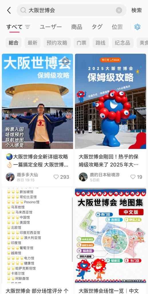 REDで「大阪万博」と検索すると、「門票价格(チケットの価格)」「交通方式(アクセス)」「展馆推荐(おすすめパビリオン)」といったキーワードが頻出します。中でもAR・VR技術を使った体験型展示や、映像演出に関する投稿が拡散力を持っている点が特徴です。また、「值不值得去(行く価値があるか?)」という問いかけとともに、訪問体験を詳細にレビューする投稿が好まれ、実際に行くかどうかをREDで判断するユーザーも少なくありません。