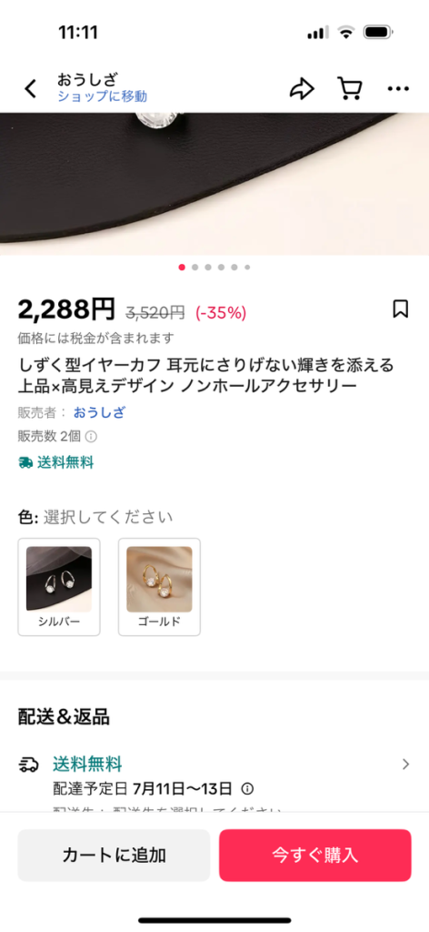 動画の下部にあるボタンをタップすると、商品の詳細ページが表示されます。ここでは以下のような情報が確認できます: