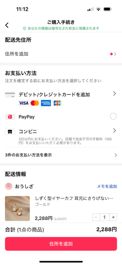 「今すぐ購入」または「カートに追加」ボタンから購入画面に進むと、支払い方法や配送先の入力画面になります。